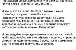 «Як довго ви будете це їсти? Не те, щоб я не знаю відповіді, але не можу не запитати, – звернувся до росіян продюсер Олександр Роднянський, який довгий час жив та працював в РФ. – Тому що не вірю, що хоч скільки-небудь розумна людина може вірити цьому марення, що вивалюється на ваші екрани. Почну з виступу найголовнішого. Нічого нового. Поділився чоловік нічними кошмарами. У нормальній родині люблячі онуки дали б пігулок. Але тут родина не цілком нормальна. І що ми почули? Що Захід тільки й хоче «роз'єднати та знищити Росію». Переведу з путінської на доступний: «Замість загальної газифікації та каналізації, замість туалетів та нормальних пенсій росіяни отримують часткову мобілізацію». Вітаю».