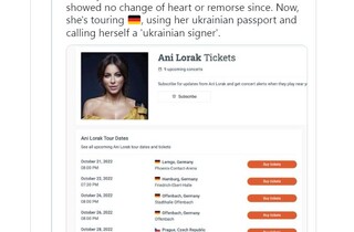 Кілька місяців тому співачка Ані Лорак, яка під час війни продовжує жити та працювати в Росії, анонсувала концерти у містах Чехії та Німеччини. Про це стало відомо з інформації на офіційному сайті виконавиці. З жовтня по листопад Лорак планувала виступати у європейських містах – Лемго, Гамбурзі, Дортмунді, Оффенбаху, Празі, Нюрнберзі та інших.