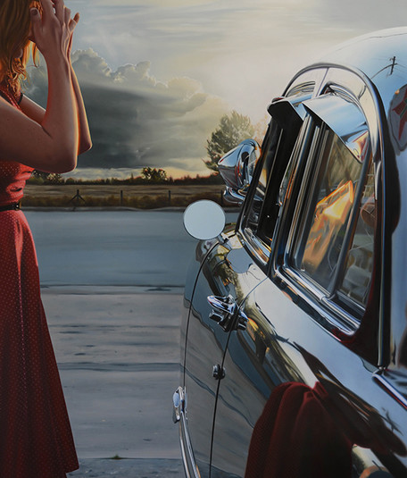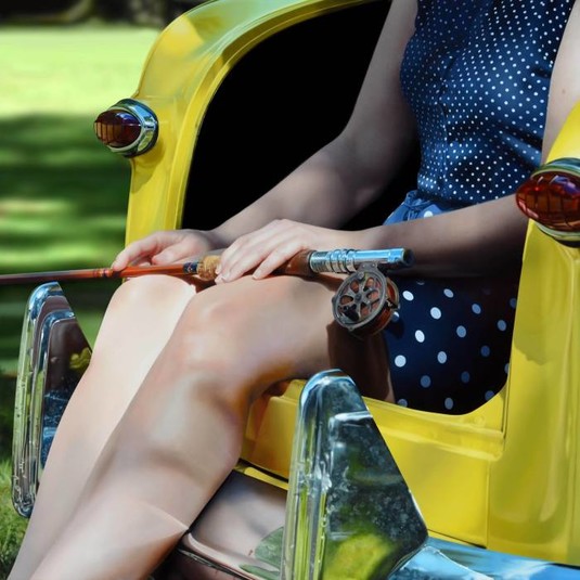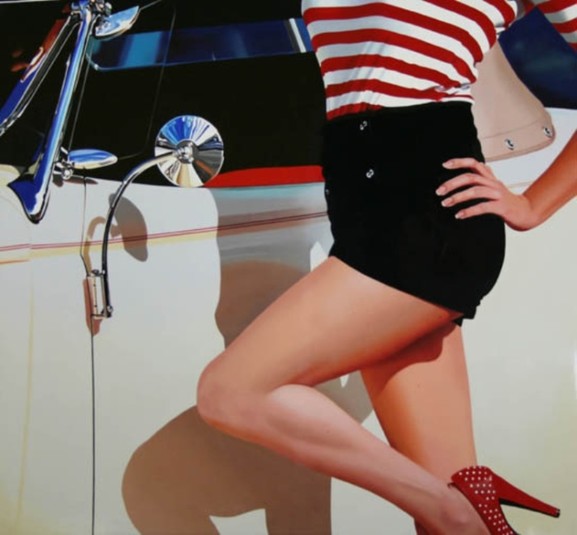 Но на самом деле это картины написанные маслом и акриловыми красками. Художник старательно акцентирует внимание на деталях: солнечные лучи, блики фар, стройные ножки или выбившаяся прядь волос, раздуваемая ветром... Именно поэтому он рисует отдельные фрагменты, чтобы не привлекать внимание зрителя к конкретному образу. Ведь о самой героине способны рассказать такие мелочи, как: оборки платья, попавшие в «кадр», её отражение в боковом зеркале или ручке автомобиля, цвет помады на губах, аксессуары и даже обувь.