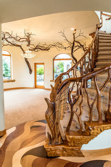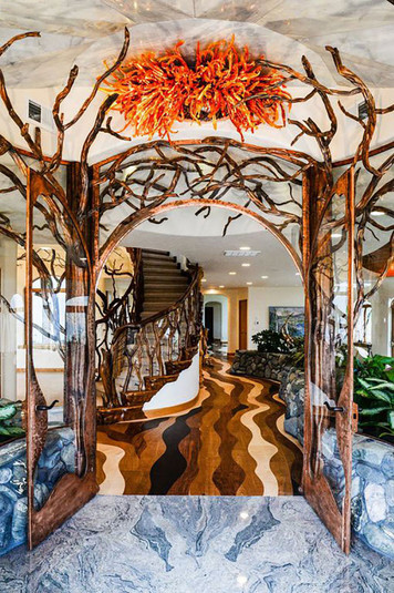 Сложнейшие и сделанные вручную детали интерьера — то, что делает этот дом уникальным. Бемис потратил полтора года, вырезая из бразильской свитении входную дверь.