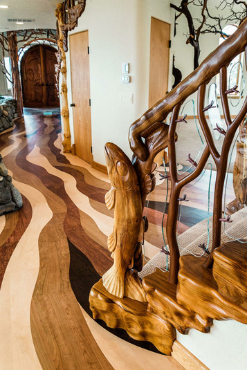 Все детали, а также полы из вишни и клена создают иллюзию струящегося потока. Над камином выложены мозаикой драконы пламени и льда. Ванные комнаты выложены голубым гранитом в стиле картин Ван Гога.