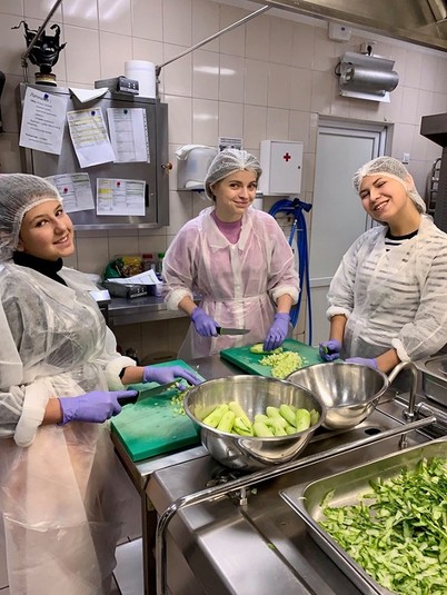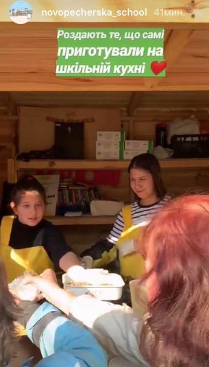 Школьники помогали проекту, который занимается раздачей еды малоимущим, «Обед без бед». Всего в Киеве 13 таких точек, где можно бесплатно получить горячий обед, приготовленный волонтерами. В этот раз еду готовили на кухне школы, где учится Александра.