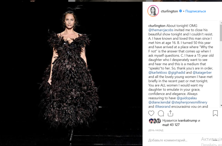 Американская супермодель Кристи Тарлингтон после многолетнего перерыва вернулась на подиум. 50-летняя красавица сделала это ради модельера Марка Джейкобса, а еще ради своей 15-летней дочери Грейс.