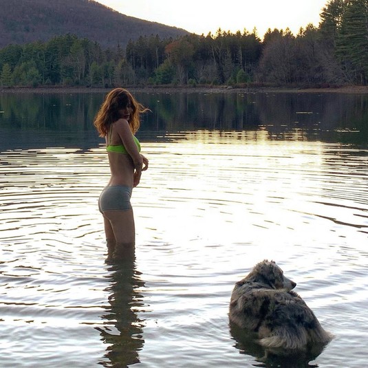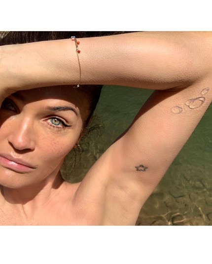 Знаменитость сфотографировалась в черном слитном купальникена фоне лесного пейзажа. На одном из кадров она стоит лицом к фотографу, демонстрируя костюм, а на другом - ухватившись за дерево и спиной к камере. Помимо этого, модель опубликовала два селфи, показав татуировку в виде звезды на руке.