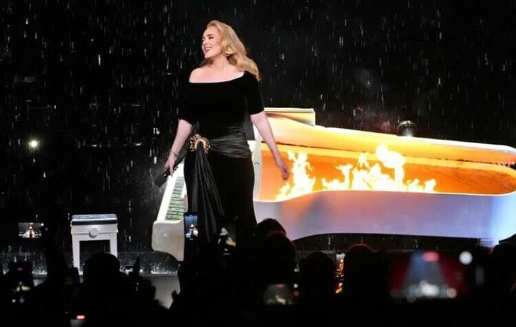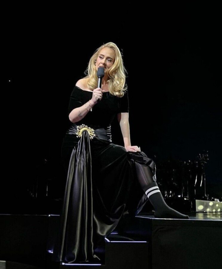 Перед глядачами, які зустріли 34-річну британську співачку стоячими оваціями, Адель з'явилася в стильно чорній сукні – з драматичним декольте і поясом, що ще більше підкреслює фігуру співачки, яка за останні роки дуже змінилася. Секрет наряду, що ідеально сидить, Адель розкрила в середині виступу, коли під час одного зі своїх хітів підняла спідницю і оприлюднила легінси, що стягували її тіло.