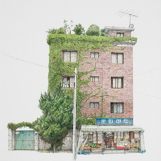 Крохотные магазинчики - одна из примет Южной Кореи. Лавочки с фруктами, едой и прочим нехитрым товаром выглядят на скетчах художницы Me Kyeoung Lee, как отдельный мир, куда не долетают тревоги и волнения.