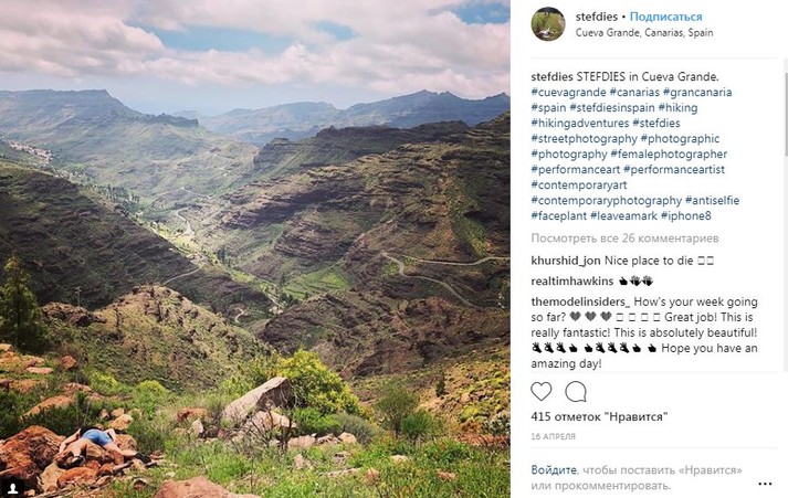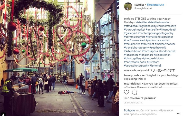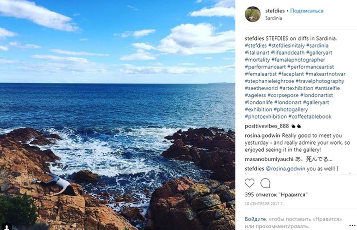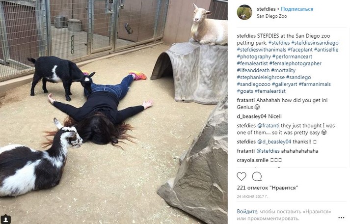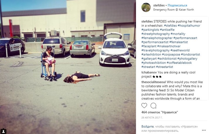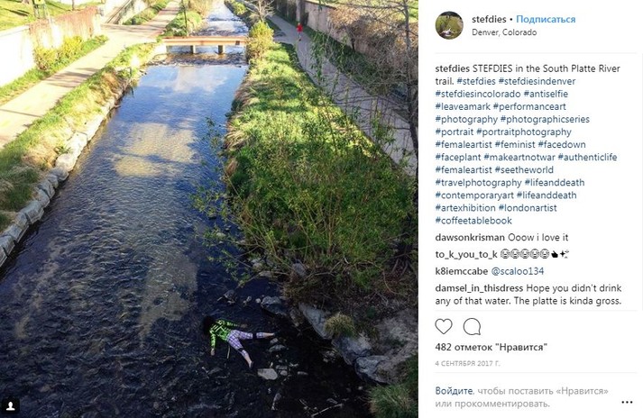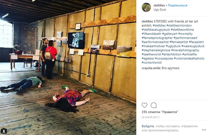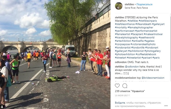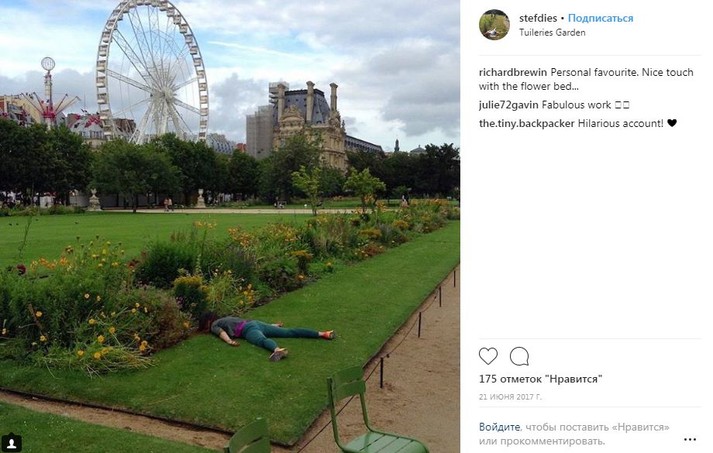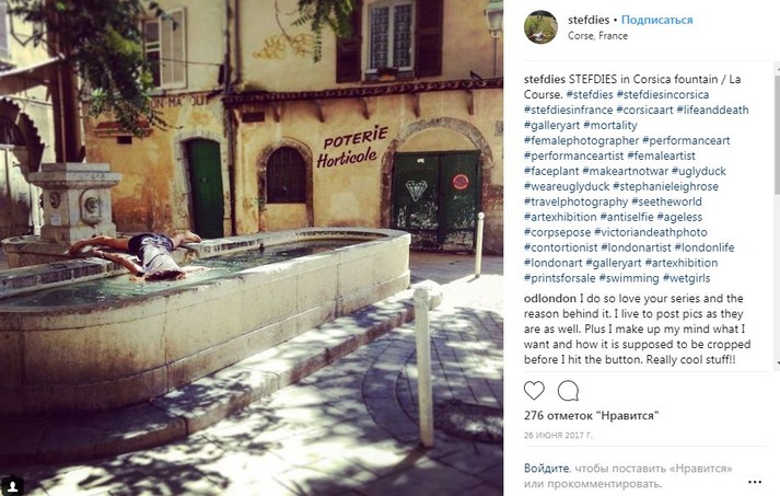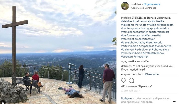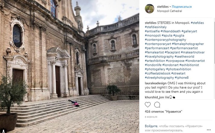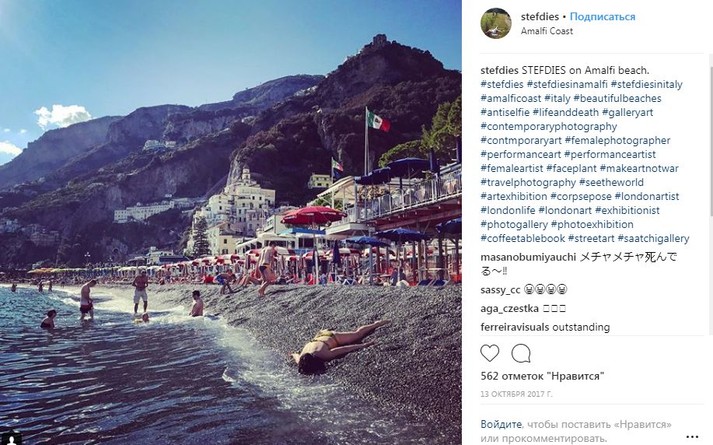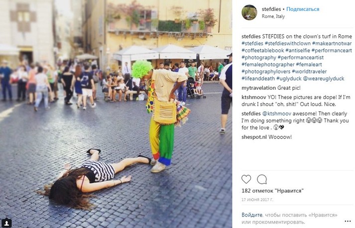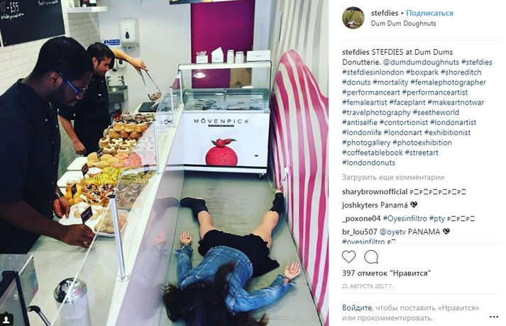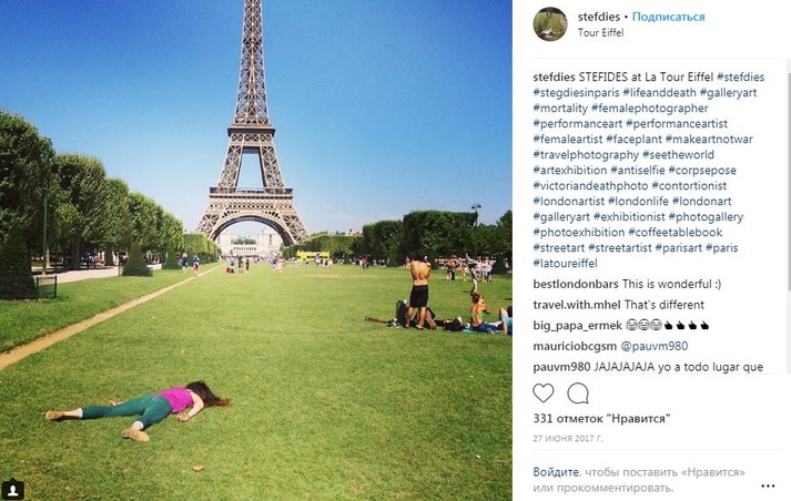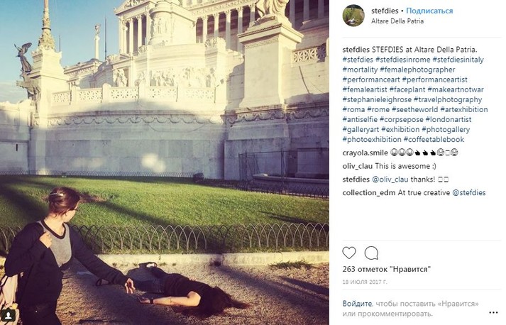 Во время путешествий по миру девушка просто падает на землю лицом вниз, притворяясь мертвой. При этом ее не смущают ни удивленные взгляды прохожих, ни грязь тротуаров.