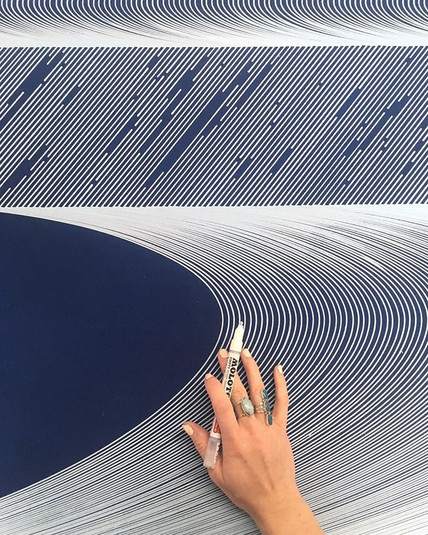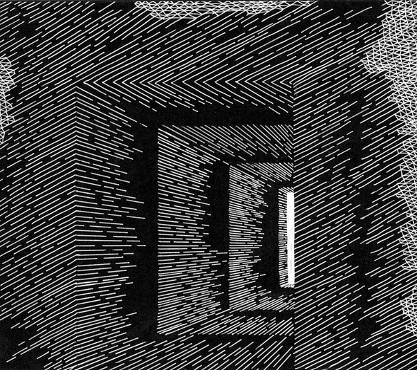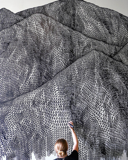 Недавно Кэти Энн занялась довольно интересным проектом, вооружившись ручкой и парочкой черных маркеров и отдав предпочтение крупным панно. Она создавала закрученные, цифровые пейзажи из черных линий.