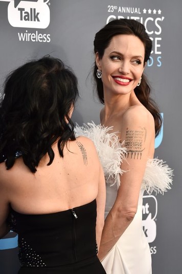 Голливудская дива Анджелина Джоли вышла на красную дорожку 23-й церемонии вручения престижной премии Critics' Choice Awards в оригинальном белом наряде. На артистке было обтягивающее платье, верх которого был украшен пышными перьями.