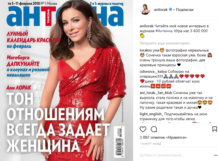 Популярная украинская певица Ани Лорак стала героиней российского глянца «Антенна». Отдельные снимки из фотосессии она опубликовала на своей странице в Instagram. На них артистка позирует вместе со своей дочерью Софией Налчаджиоглу, сообщает «Главком».