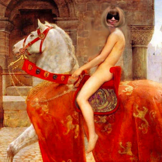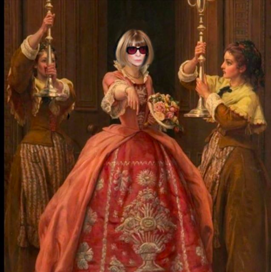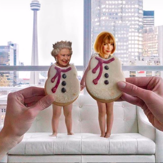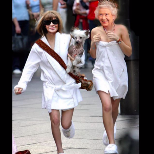 Помимо выражения любви и преданности главреду Vogue US, автор аккаунта переосмысливает фигуру британской королевы Елизаветы.