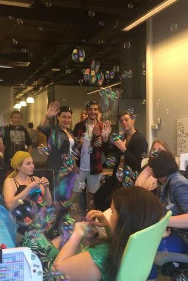 Затем в офисе была устроена вечеринка с легкими коктейлями и бармен-шоу, а все помещение наполнилось мыльными пузырями – для создания атмосферы праздника коллеги Анны привезли специальную машину для их производства.