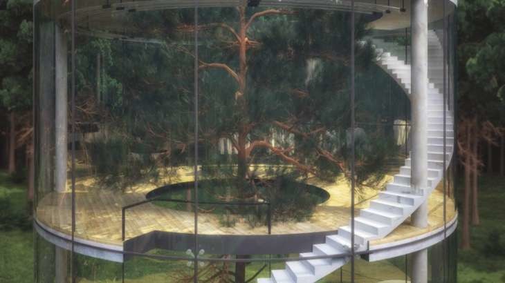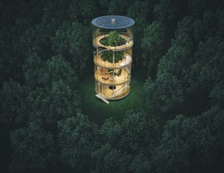 Айбек Алмасов описывает своё творение как «альтернативу бетонным джунглям». Цилиндрический фасад дома обеспечивает невероятный обзор в 360 градусов, а живое дерево внутри производит не только потрясающее впечатление, но и кислород. Что же касается энергии, то её предполагается получать при помощи стеклянных солнечных панелей на крыше дома.
