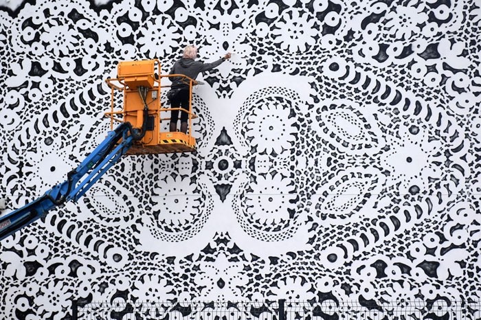 А вот художница из Вроцлава под псевдонимом NeSpoon делает мир еще и красивым. Она создает стрит-арты словно кружево. Ее рисунки можно увидеть не только на фасадах зданий, но и на асфальте, и на ажурной плитке. Она создает свои картины не только с помощью красоток. Также она орудует с нитками и глиной.