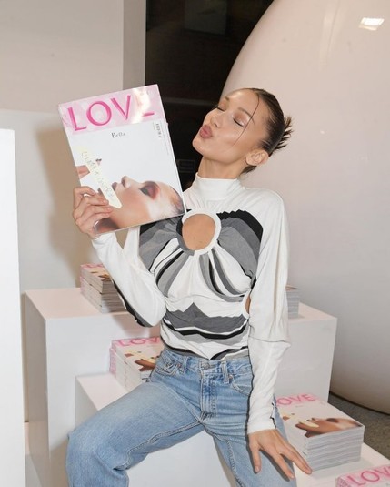 23-летняя модель охотно позировала перед камерами с журналом в руках. Для этого светского выхода она выбрала водолазку белого цвета с вырезами и голубые джинсы с высокой талией.