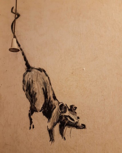 На ней изображены девять крыс (постоянный символ, который использует Бэнкси), которые устроили беспорядок в ванной комнате. На общем снимке в отражении зеркала можно увидеть, что на стене нарисованы перечеркнутые линии - таким образом ведется отчет дней.