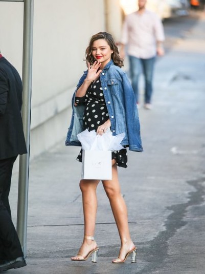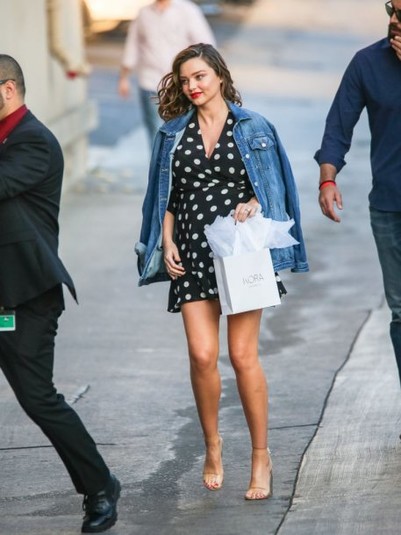 34-летняя модель из Австралии Миранда Керр появилась у популярной телепередаче в романтическом образе. Она выбрала короткое черное платье в горошек и босоножки на каблуках. При этом на плечи Миранда накинула джинсовую куртку. В данный момент звезда подиумов ждет второго ребенка.