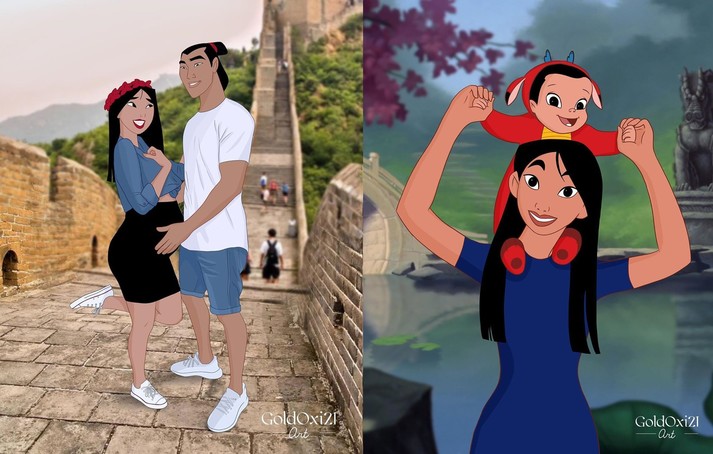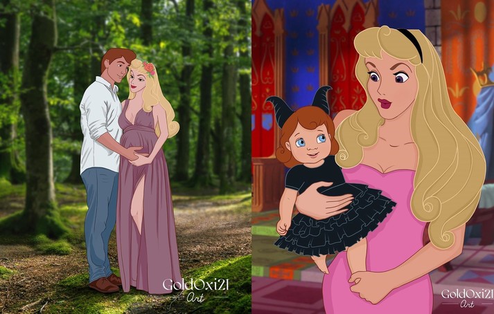 Художница Оксана Золотарева-Пащенко всегда любила диснеевские мультфильмы. Два года назад во время декретного отпуска девушка начала рисовать любимых персонажей в ролях, которые непосредственно связаны с рождением детей.