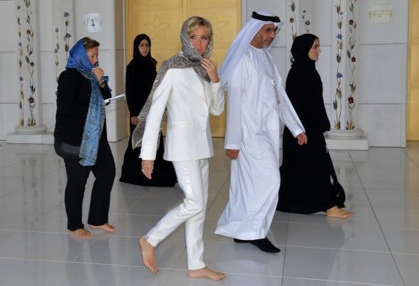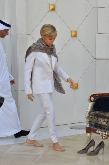 Босая, в платке и строгом костюме. Первая леди Франции удивила стильным образом