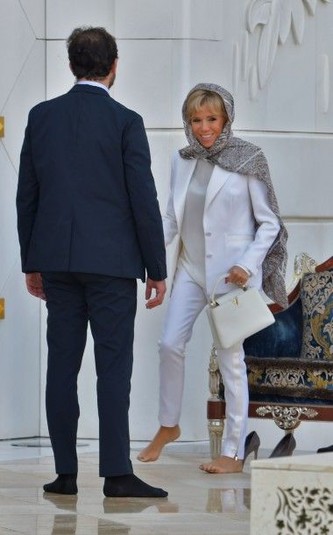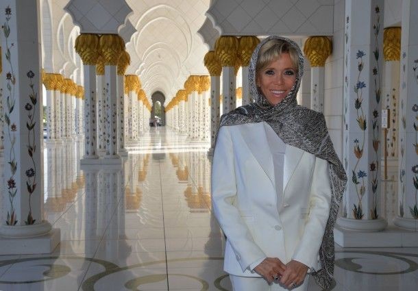 Супруга президента Франции Эммануэля Макрон, 64-летняя Бриджит продолжает удивлять своими стильными образами. На этот раз во время официального визита в Абу-Даби она посетила мечеть шейха Зайда. Специально для этого она надела белоснежный костюм от Louis Vuitton.
