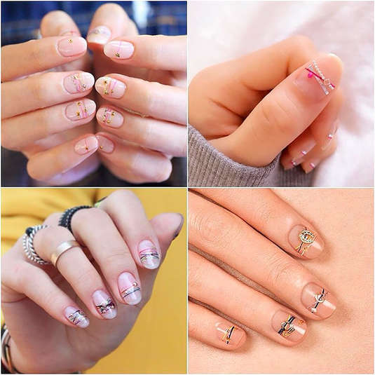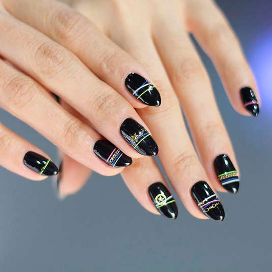 Но вы можете нарисовать эти горизонтальные полоски и обычным лаком для ногтей, а вместо подвесок использовать специальные объемные наклейки-шармы. Основной тон (или фон) для этого рисунка Ян чаще всего делает нейтральным (прозрачным, бежевым, белым или нежно-розовым), но такой маникюр хорошо смотрится и на темном лаке. Главное условие — чтобы «браслеты на ногтях» стали браслетами: одна из линий должна идти от ногтя к ногтю. То есть, полоска одного цвета должна быть на всех ногтях обязательно.