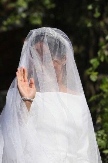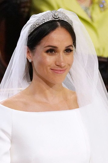 Голову Меган Маркл украшала бриллиантовая тиара, которая ранее принадлежала королеве Марии Текской, бабушке королевы Елизаветы II, а также фата Givenchy. Вышивка на фате символически показывает цветы пятидесяти трех стран Британского Содружества.