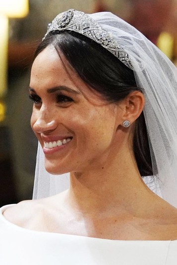 Королева Елизавета II получила головной убор в подарок от своей бабушки в 1953 году. Также на свадебную церемонию Меган Маркл надела браслет и серьги ювелирного Дома Cartier.
