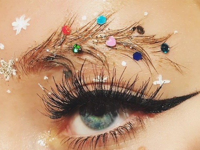 Маленькая золотистая звездочка на «верхушке» и разноцветные камушки на «веточках» станут отличным выбором к Новому году. К слову, идея сделать из бровей елку появилась благодаря забавному праздничному фильтру в гаджетах интернет-пользователей.