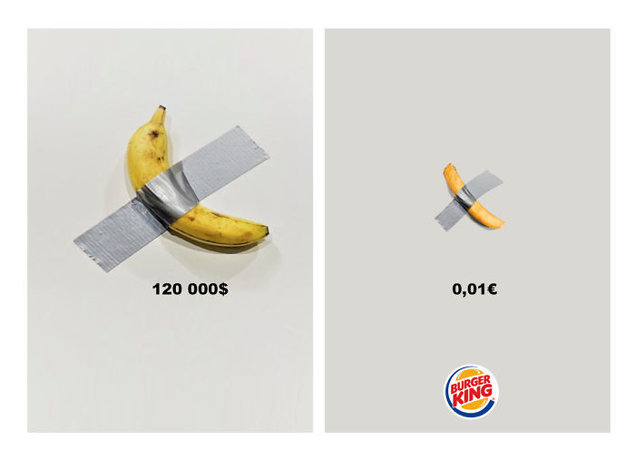 В своей кампании Burger King напомнил о цене банана, представленного на выставке, — $120 тыс. Сеть ресторанов предложила свой альтернативный «экспонат» — один кусок картошки фри за €0,01.