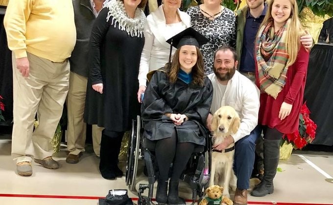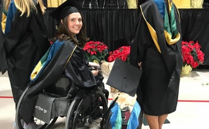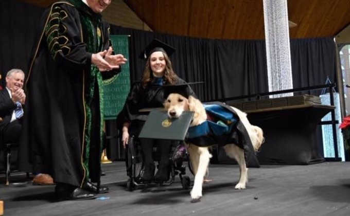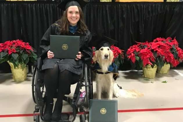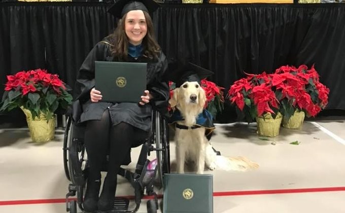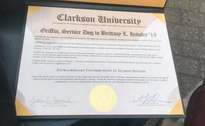 16 декабря в американском университете Кларксона, собака-поводырь по кличке Гриффин получила диплом магистра по трудотерапии вместе со своей владелицей - Бриттани Хоули. Об этом девушка рассказала на своей странице в Facebook.