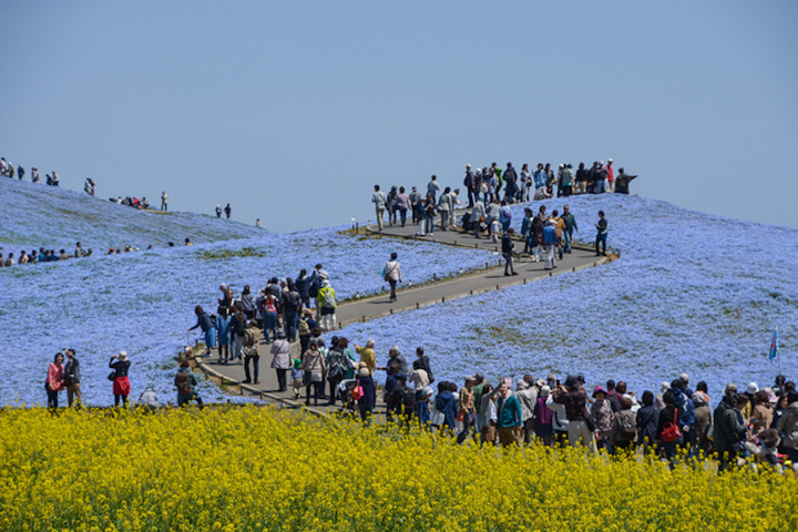 Каждую весну тысячи туристов стекаются в парк Hitachi Seaside Park в префектуре Ибараки, чтобы полюбоваться невероятным «ковром» из более четырёх миллионов голубых немофила.