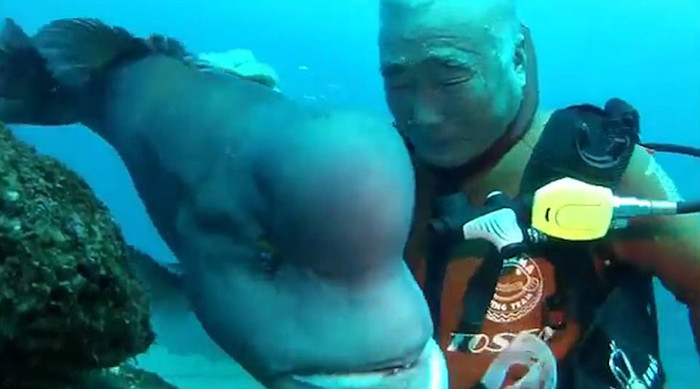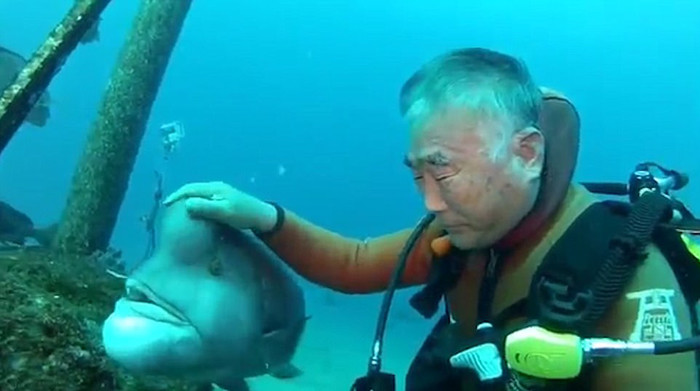 Дайвер и его удивительная подруга: японец 25 лет дружит с морской рыбой