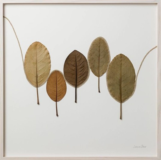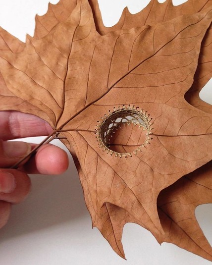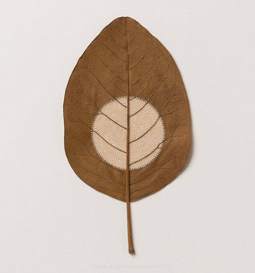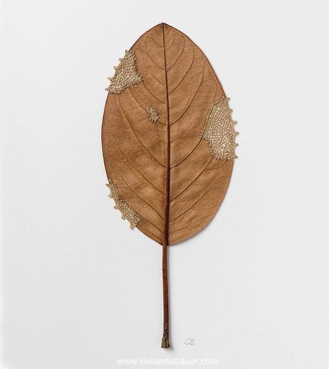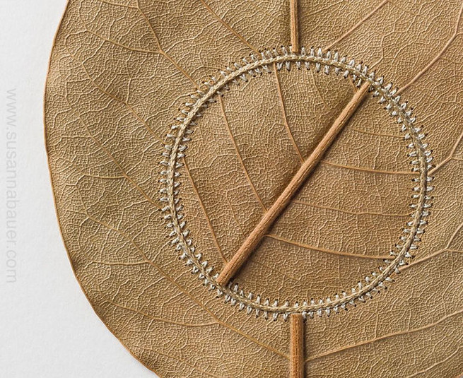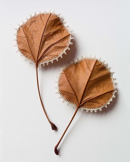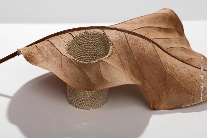 Сусанна Бауэр, дизайнер из Германии, в недавней серии работ под названием «Связи» представила хрупкие скульптурные произведения из сухих листьев, декорированных ажурной вышивкой.