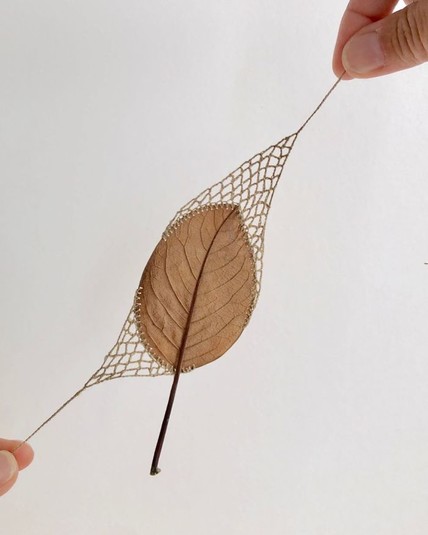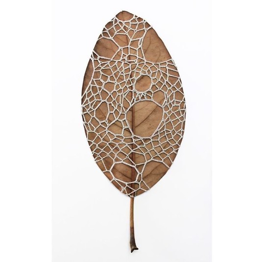 Она использует «холсты» из сухих листьев магнолии, на которую тонкой иглой или вязальным крючком наносит ажурные узоры их хлопчатобумажных нитей.