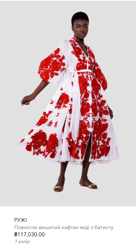 Як повідомляє «Главком» , Юлія Тимошенко обрала біло-червоний жіночий кафтан міді з колекції «Ружі» дизайнерки Юлії Магдич. Така сукня коштує 117 тис. грн і була виготовлена вручну за 72 години з батисту та 18 км ниток.