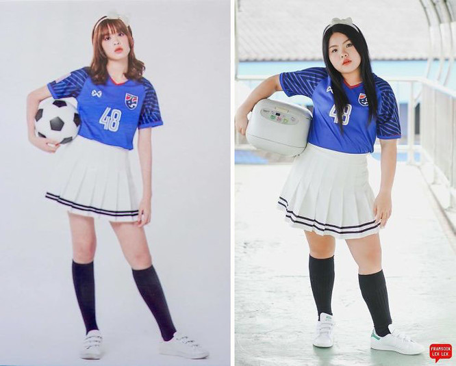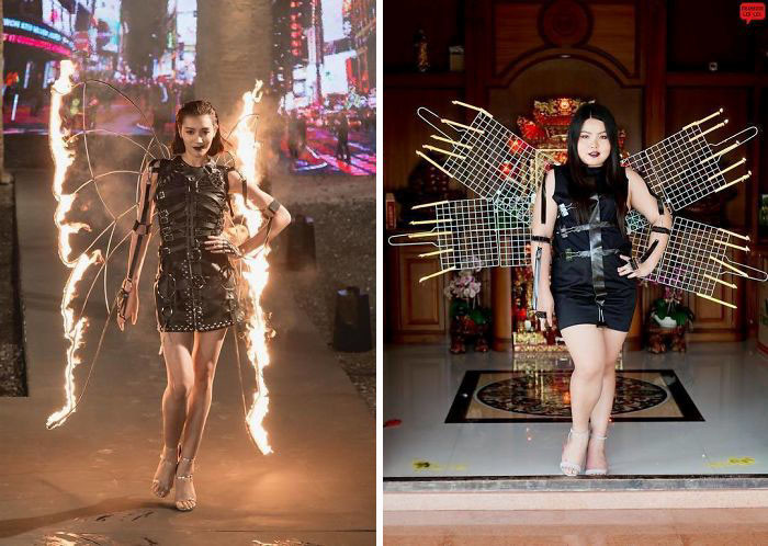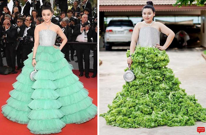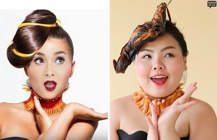 22-летняя Сине Бенджафхорн из Таиланда любит не только переодевания в известных личностей, но и вкусную еду. Решив совместить обе свои страсти, она начала создавать пародийные наряды из продуктов. «Мне нравится есть, поэтому я подумал, что еда должна быть частью моих костюмов», - сказала она. А чтобы они не попали потом в мусорку, Сине и ее семья съедают одежду после съемки.