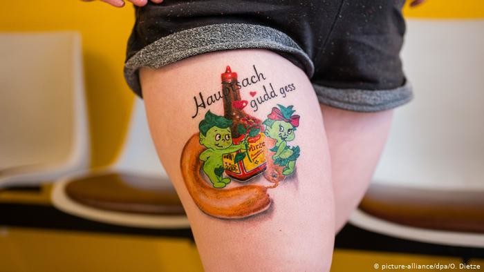 На татуировке изображены очень популярные в Сааре лионская варено-копченая колбаса, а также бутылочка соуса-приправы Магги, по потреблению которого на душу населения Саар занимает первое место в Германии. Соус есть в каждом втором доме.