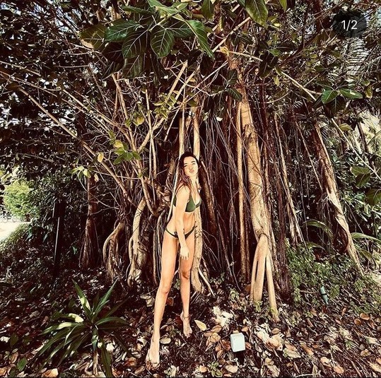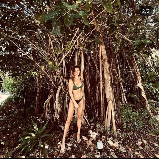 На ней красивый раздельный купальник, который красиво подчеркивает стройное тело. Девушка запечатлена в интересной локации – она стоит в каких-то зарослях, видимо, нашла их неподалеку пляжа.