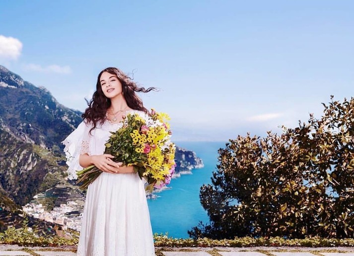 Съемка проходила на фоне роскошной природы и получилась яркой и весенней. Дева позирует в белом свободном платье с вышивкой, образ дополнил крупный кулон. Пышные волосы юной звезды свободно развеваются на ветру, в руках она держит огромный букет цветов.