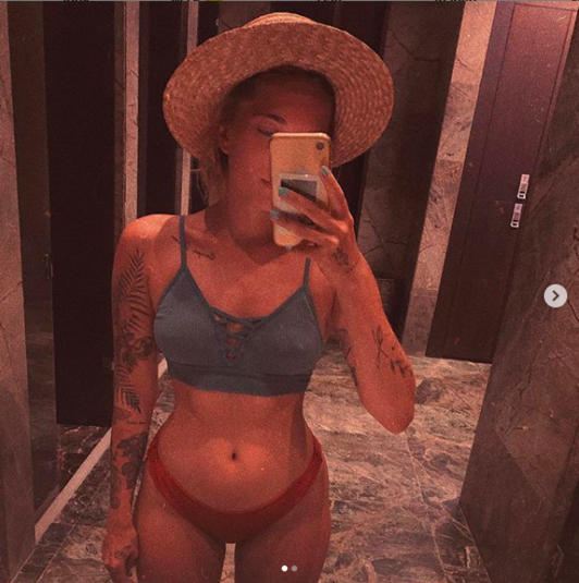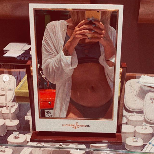 И на одном, и на другом снимках она показательно выпячивает свой живот, на руке у нее есть татуировка, стоит перед зеркалом прямо в нижнем белье, но лицо прячет за телефоном. Также на ней есть шляпа и рубашка: