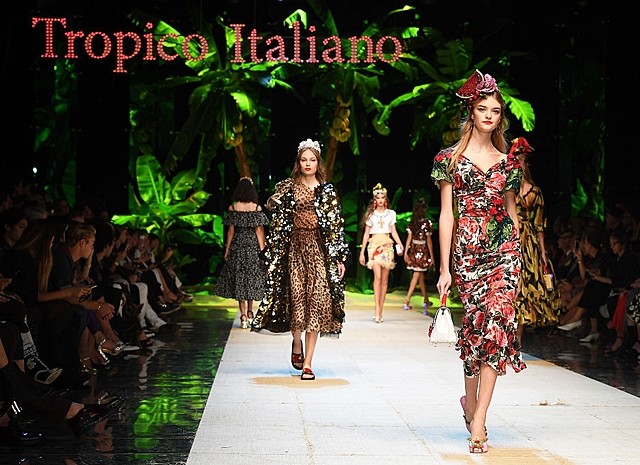 Что касается самого показа Dolce&Gabbana, здесь кудесники Доменико Дольче и Стефано Габбана вновь проявили недюжинный креатив и сумели удивить публику выбранным концептом. На этот раз гости шоу были приглашены в "итальянские тропики": из бара, главным напитком которого был кокосовый сок, зрители попадали на танцевальную вечеринку, а только потом - на дефиле. Здесь было все - яркие краски, разнополярные фактуры, кричащие надписи и, конечно, массивные аксессуары - короны, очки, сумки и шляпы в виде арбузных корок. Завершился показ зажигательными танцами, на которые моделей сагитировали вышедшие на подиум танцоры.