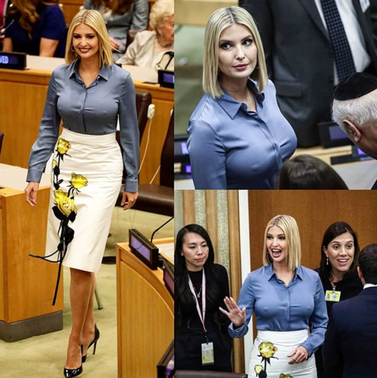 Вчера 37-летняя дочь президента США Иванка Трамп приняла участие в Генеральной Ассамблее ООН в Нью-Йорке, а также выступила на ежегодном саммите Concordia. Для важного события Иванка выбрала элегантный образ: идеальную укладку, эффектный макияж, миди юбку Prada с 3D-изображением роз стоимостью в две тысячи долларов, лакированные черные туфли и голубую рубашку.