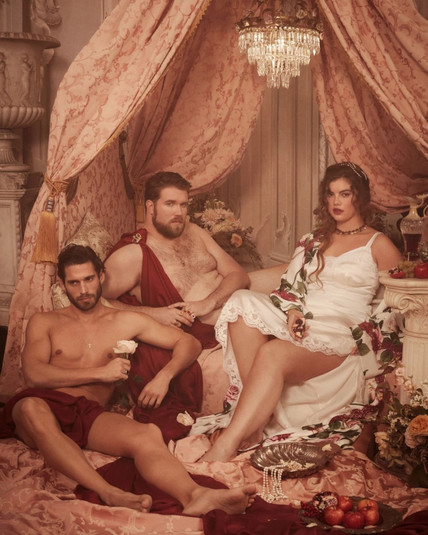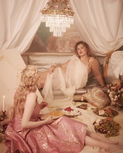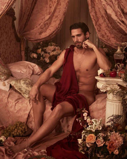 Драпированные шторы, золотистые узоры, расслабленные томные позы и нежные натюрморты – съемка пропитана настроением роскошного гедонистического романтизма