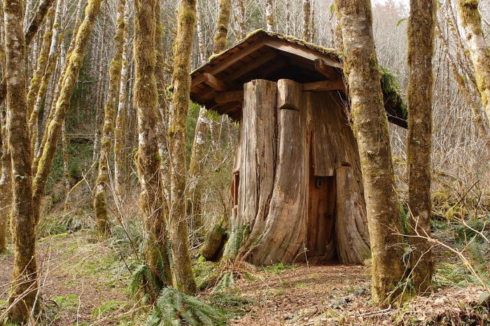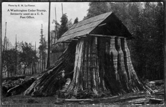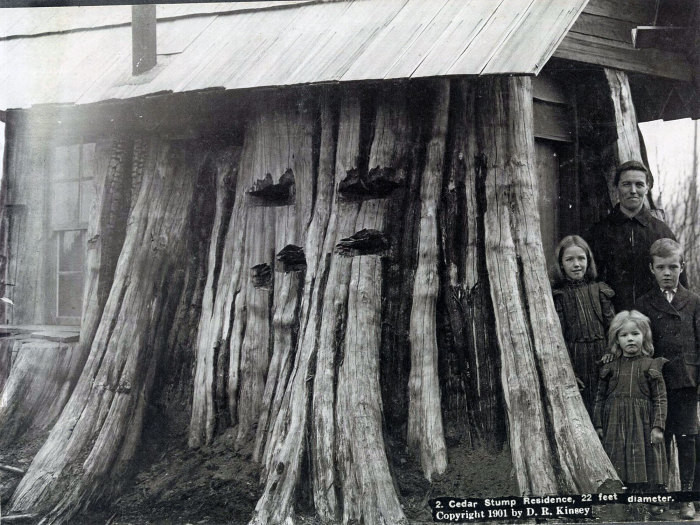 После вырубки вековых лесов в тех краях оставались громадные пустоши, «утыканные» 3-метровыми пнями секвой и кедров. Лесорубы бросали их, считая бесполезными. Ведь древесина в нижней части дерева, у корней, меняет свою структуру и быстро портится.