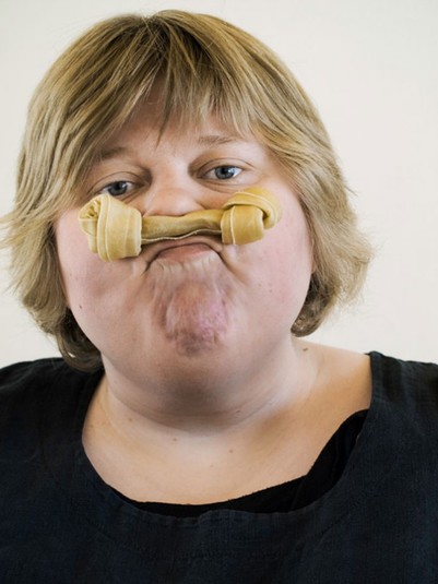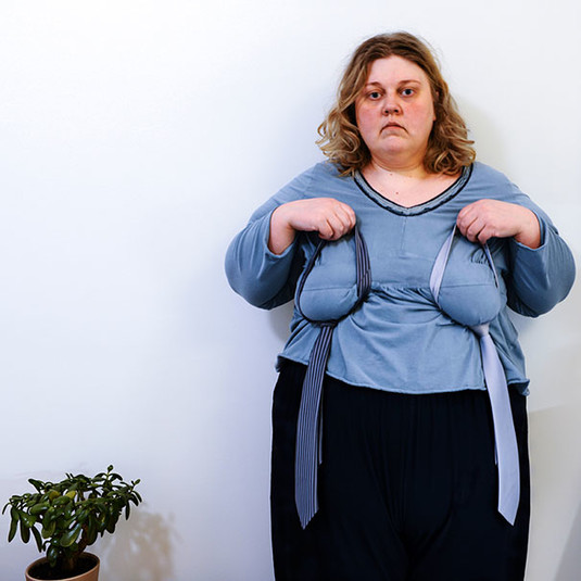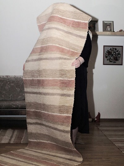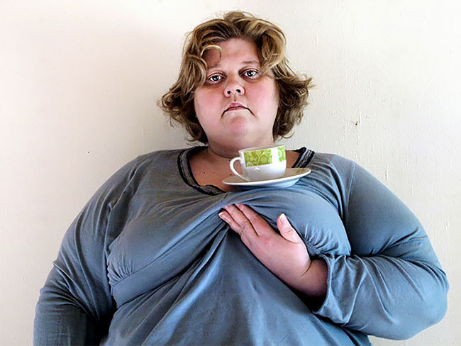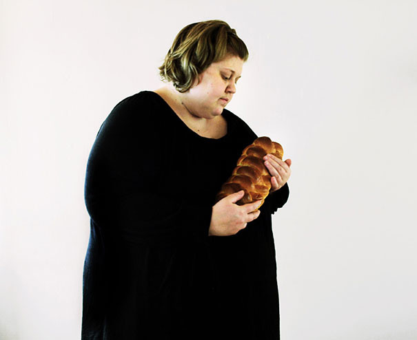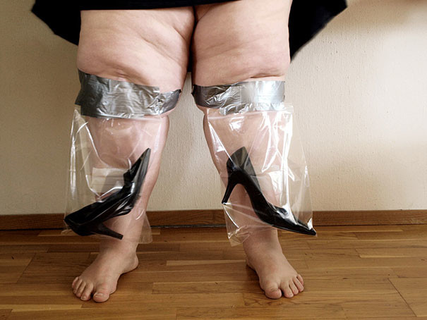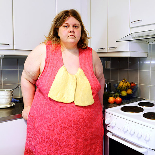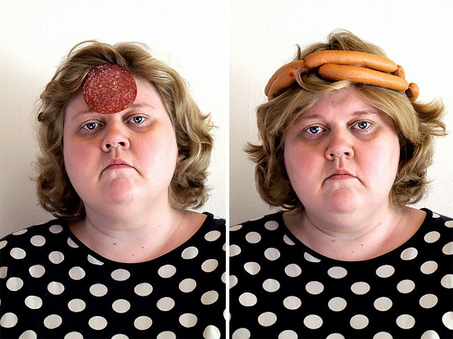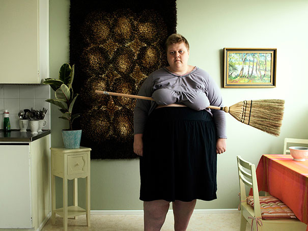 Ииу снимает в домашних условиях и, кажется, высмеивает этот самый домашний образ жизни, а возможно, и те границы, в которых мы обязаны жить. Фотограф специально надевает предметы одежды неправильно и использует повседневные предметы обихода непривычным образом.