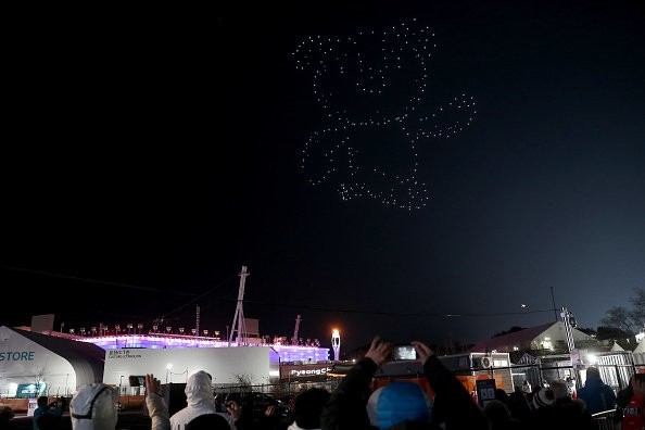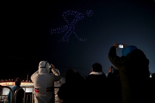 На кадрах с церемонии запечатлено, как дроны со светодиодами в течение нескольких минут летали над участниками соревнований, а после в воздухе выстроились в различные олимпийские фигуры, в частности олимпийскую эмблему из пяти колец.