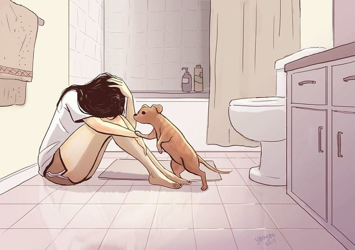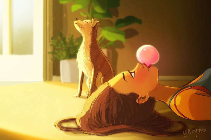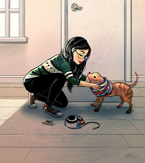 Yaoyao Ma Van As - художник, иллюстратор и «время от времени аниматор». Так сказано на ее личном сайте, где девушка делиться новыми работами. Сама она обожает животных, с ней дома живет пес, так что серия рисунков вдохновлена собственным опытом автора. Даже внешне героиня рисунков похожа на Yaoyao.