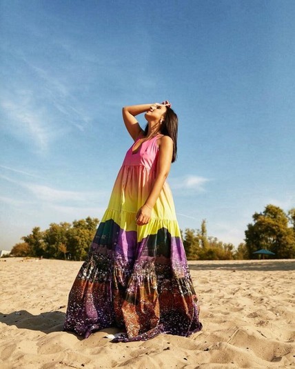 На опубликованных фото Джамала позировала в длинном разноцветном сарафане свободного кроя от отечественного бренда Poustovit.