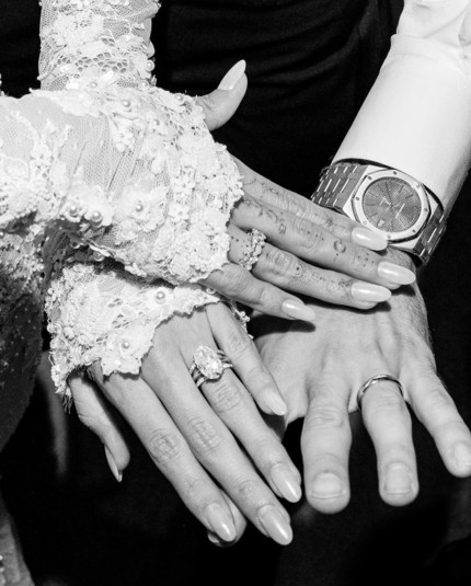 Образ был расшит цветочными аппликациями и жемчужинами разного размера. Изюминкой наряда стала четырехметровая фата, на которой была вышита надпись «Till Death Do Us Part» («Пока смерть не разлучит нас»).
