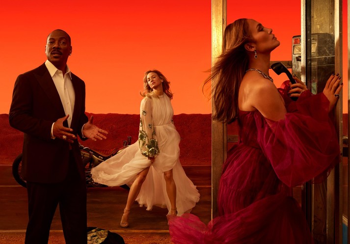 Завершают образ колье с драгоценными камнями, а также берет из лакированной кожи. 50-летняя красавица в компании Рене Зеллвегер и Эдди Мерфи сидит на мотоциклах на фоне красочных пейзажей пустыни.